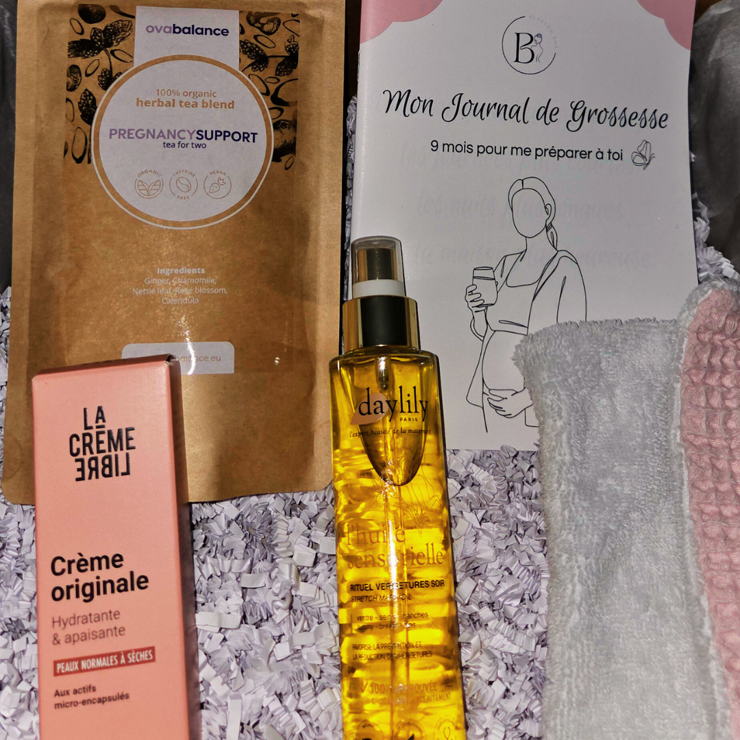 Cette box contient une sélection de produits pensés pour le bien-être, le réconfort et l’apaisement, adaptés au début de grossesse, comme par exemple :